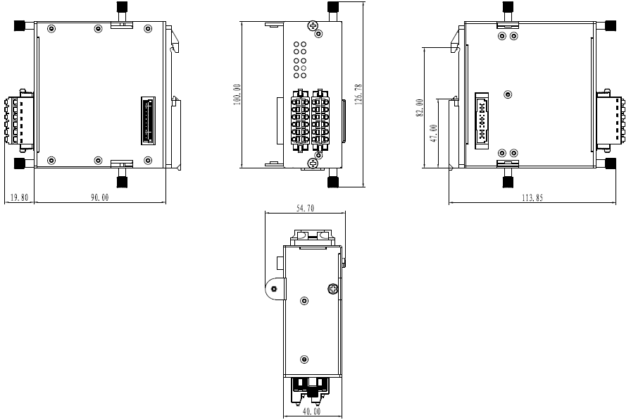 | 機(jī)械結(jié)構(gòu) | 機(jī)械結(jié)構(gòu) 鋁質(zhì)外殼 防護(hù)等級 IP20 尺寸 40mm x 100mm x 90mm (W x H x D) 整機(jī)重量 500g 安裝方式 導(dǎo)軌安裝 |