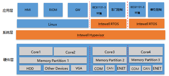 Intewell操作系統(tǒng)基于微內(nèi)核的虛擬化技術(shù),構(gòu)建了列車(chē)控制系統(tǒng)的底層技術(shù)平臺(tái)。如下圖所示,Intewell對(duì)上承載基礎(chǔ)控制軟件及面向軌交的行業(yè)應(yīng)用軟件,支撐智能化應(yīng)用,對(duì)下兼容各類(lèi)硬件設(shè)備和處理器,支持WTB/MVB/CAN總線及以太網(wǎng)通訊。
