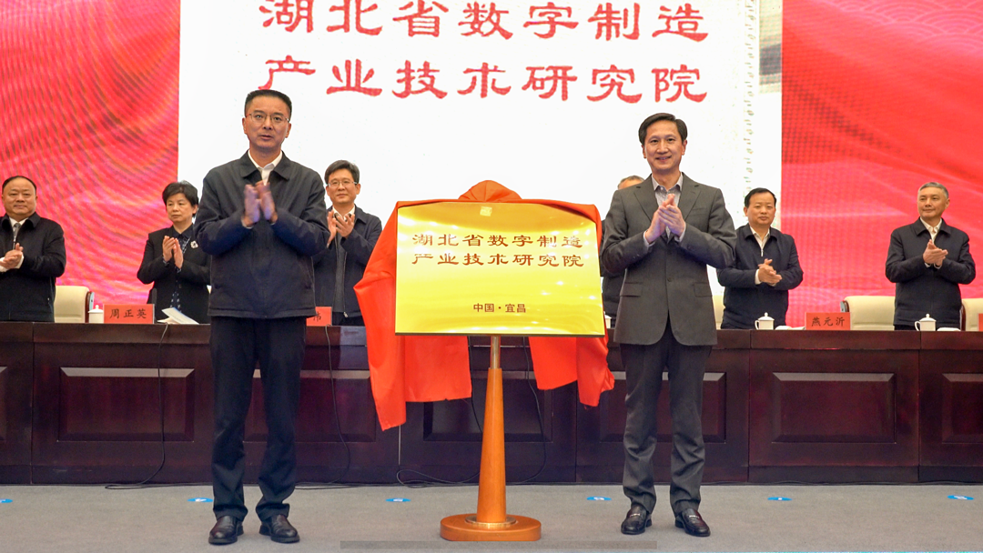 中共宜昌市委書記熊征宇(左)、北京東土科技董事長李平(右)共同為湖北省數(shù)字制造產(chǎn)業(yè)技術(shù)研究院揭牌