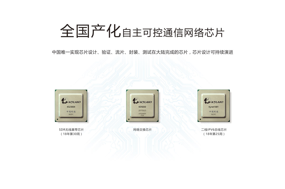 中國(guó)第一款國(guó)內(nèi)設(shè)計(jì)、國(guó)內(nèi)生產(chǎn)流片、國(guó)內(nèi)測(cè)試封裝的完全自主可控的通信網(wǎng)絡(luò)交換芯片KD5660;中國(guó)第一款實(shí)時(shí)白名單網(wǎng)絡(luò)安全交換芯片KD5665;完全自組可控的自組網(wǎng)SDR軟件無(wú)線電基帶芯片。