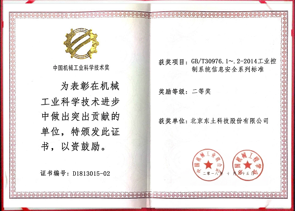 東土科技參與制定的“GB/T30976.1~.2-2014工業(yè)控制系統(tǒng)信息安全系列標(biāo)準(zhǔn)”榮獲中國機(jī)械工業(yè)科學(xué)技術(shù)獎二等獎。