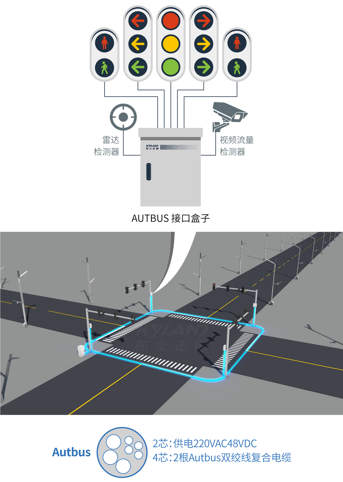 信號燈、傳感器、視頻通過兩線模塊集成后實現(xiàn)總線連接和智能化管理