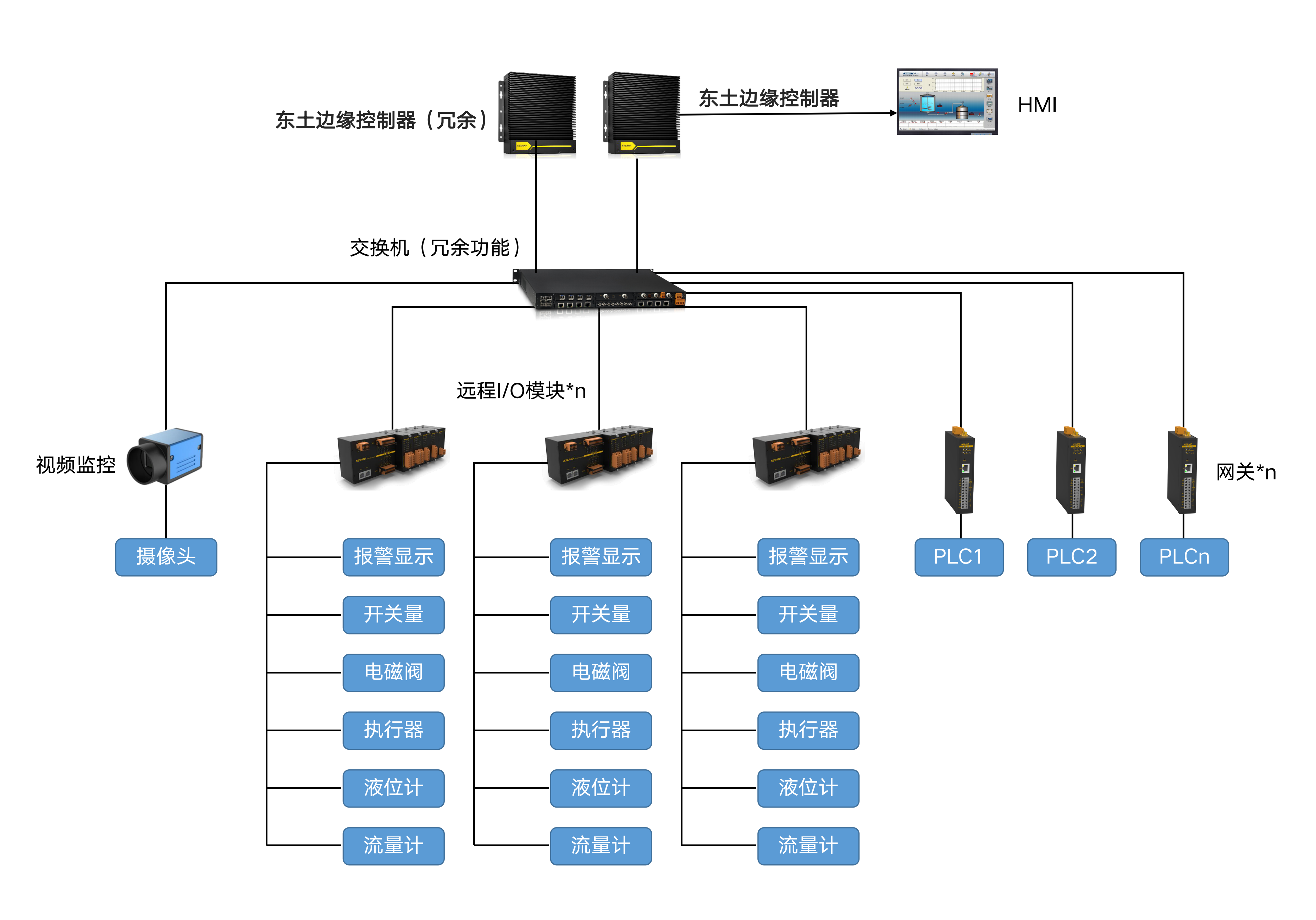 在中石化某大型油氣田現(xiàn)場(chǎng),將站場(chǎng)原來眾多品牌小規(guī)模PLC及IO產(chǎn)品統(tǒng)一替換成東土邊緣控制器產(chǎn)品,做到自主可控、擴(kuò)展便利及冗余備份實(shí)時(shí)控制;利用東土通訊網(wǎng)關(guān)KyGate解決無法與上位建立數(shù)據(jù)交互PLC控制系統(tǒng)連接問題;整合原有SCADA監(jiān)控系統(tǒng),滿足整體統(tǒng)一監(jiān)控、加強(qiáng)數(shù)據(jù)集成分析,并結(jié)合視覺分析建立采油現(xiàn)場(chǎng)安全管控,實(shí)現(xiàn)智能控制下沉到工業(yè)現(xiàn)場(chǎng)。