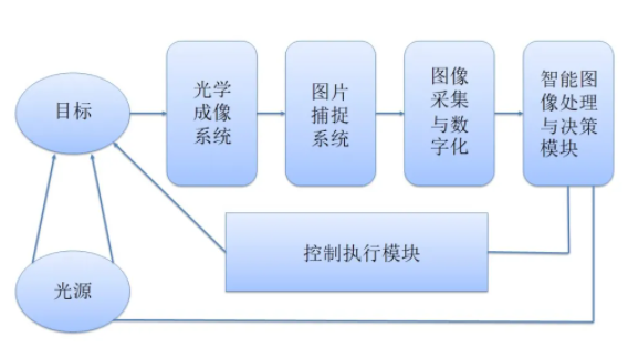 機(jī)器視覺即用機(jī)器代替人眼來做測(cè)量和判斷,工作流程大致為:被攝取目標(biāo)——經(jīng)圖像攝取裝臵——圖像信號(hào)——經(jīng)圖像處理系統(tǒng)——數(shù)字信號(hào)——經(jīng)抽取目標(biāo)特征——判斷結(jié)果并控制設(shè)備。該流程的實(shí)現(xiàn)需相應(yīng)的硬件作為基礎(chǔ),典型的工業(yè)機(jī)器視覺系統(tǒng)構(gòu)成有照明、鏡頭、相機(jī)、圖像采集卡、視覺處理器等。