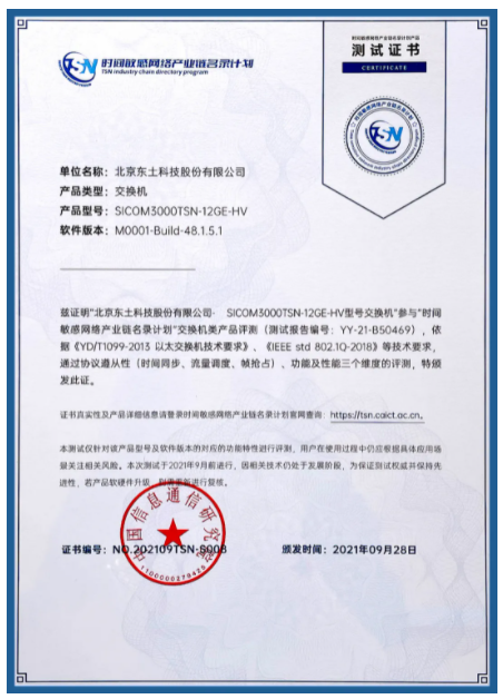 東土科技全系列TSN工業(yè)網(wǎng)絡(luò)產(chǎn)品包含芯片、交換機(jī)、終端、交換軟件平臺、CNC及邊緣控制器等,其中SICOM3000TSN交換機(jī)于2021年9月28日在工業(yè)和信息化部主辦的“2021工業(yè)互聯(lián)網(wǎng)網(wǎng)絡(luò)創(chuàng)新大會”上榮獲首批“時間敏感網(wǎng)絡(luò)(TSN)產(chǎn)業(yè)鏈名錄計劃”測試認(rèn)證證書,并已在重慶、西安、沈陽等地實際工廠進(jìn)行應(yīng)用,系統(tǒng)提供了微秒級確定性服務(wù),保證實時性需求;產(chǎn)品可降低整個通信網(wǎng)絡(luò)復(fù)雜度,實現(xiàn)周期性數(shù)據(jù)和非周期性數(shù)據(jù)同時傳輸;有效提升了產(chǎn)線中工業(yè)控制流量傳輸?shù)膶崟r性、確定性和網(wǎng)絡(luò)的穩(wěn)定性。
