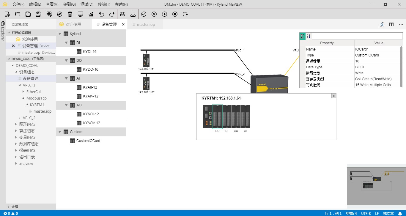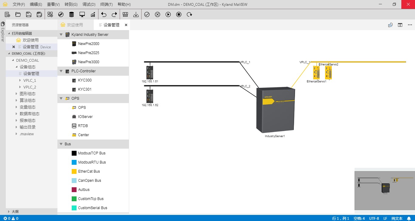 | 設(shè)備組態(tài) | 圖形化拖拽式添加設(shè)備,含東土工業(yè)服務(wù)器,東土PLC控制器,業(yè)務(wù)總線(xiàn)以及遠(yuǎn)程IO設(shè)備 提供縮略圖窗口支持快速定位 工業(yè)服務(wù)器冗余配置 業(yè)務(wù)總線(xiàn)包括Modbus TCP,Modbus RTU,EtherCAT,CANopen,AUTBUS以及自定義TCP和自定義串口 支持配置總線(xiàn)關(guān)聯(lián)控制器,物理端口和IP信息 支持配置添加?xùn)|土IO設(shè)備及第三方IO設(shè)備,自動(dòng)生成IO變量 ![]() ![]() |