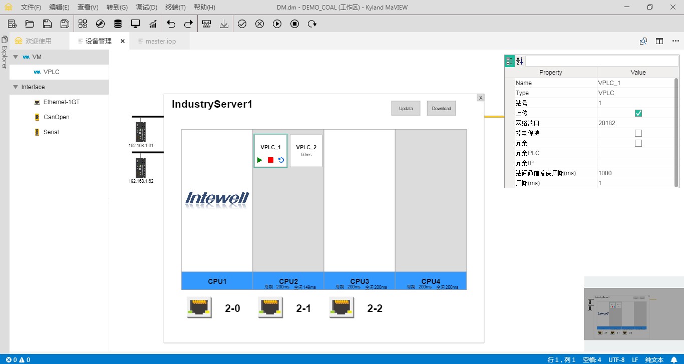 | 虛擬化配置 | 虛擬PLC物理核心配置 圖形化創(chuàng)建虛擬PLC及分配接口資源、冗余設(shè)置 支持虛擬網(wǎng)口配置,每個(gè)物理網(wǎng)口可以分配多達(dá)7個(gè)虛擬PLC使用 支持虛擬化配置導(dǎo)入、導(dǎo)出、讀取、下裝功能 支持虛擬PLC運(yùn)行控制及狀態(tài)監(jiān)測(cè) ![]() |