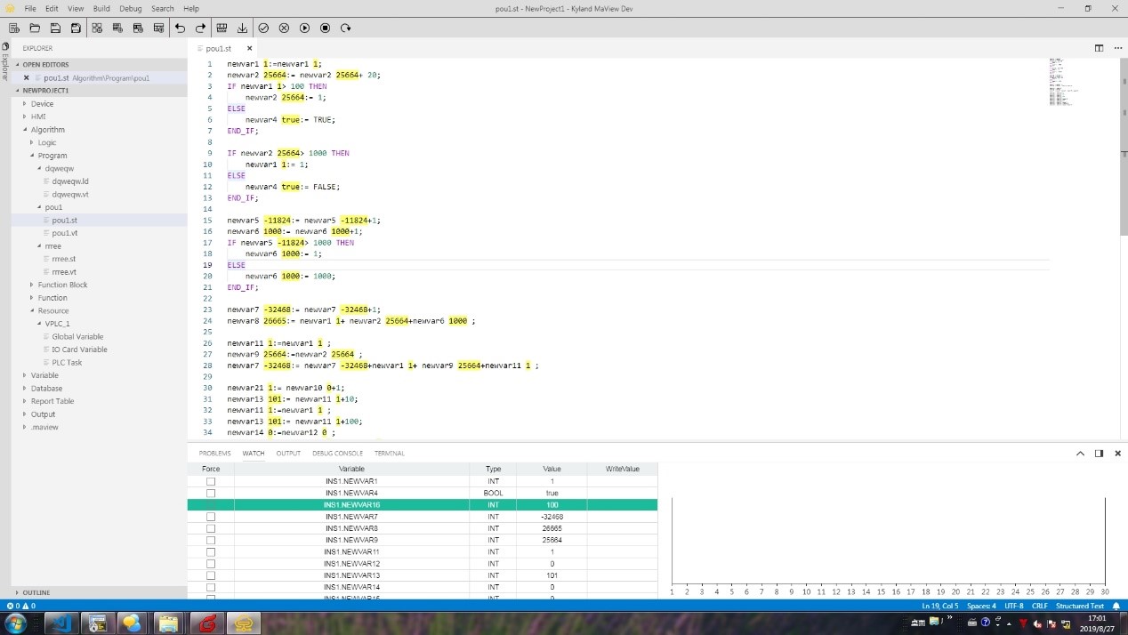 | 算法組態(tài) | -算法組態(tài) 支持IEC61131-3 ST,LD,FBD編程語(yǔ)言 每個(gè)虛擬PLC支持配置多達(dá)10個(gè)不同優(yōu)先等級(jí)和周期的實(shí)例任務(wù) 變量聲明支持導(dǎo)入導(dǎo)出功能 算法程序文件導(dǎo)入導(dǎo)出 支持控制器的全局變量管理及IO變量管理 支持功能塊的結(jié)構(gòu)體引用 變量、語(yǔ)句聯(lián)想功能 變量掉電保持定義 提供變量全局搜索功能,支持直接跳轉(zhuǎn)程序 -C++支持 提供獨(dú)立的MaVIEW Lib Developer工具用于創(chuàng)建C++的庫(kù) 支持導(dǎo)入C++源碼文件 支持導(dǎo)入Matlab/Simulink生成的C++文件 發(fā)布C++程序?yàn)镕unction Block模塊庫(kù),可導(dǎo)入MaVIEW ![]() ![]() ![]() |