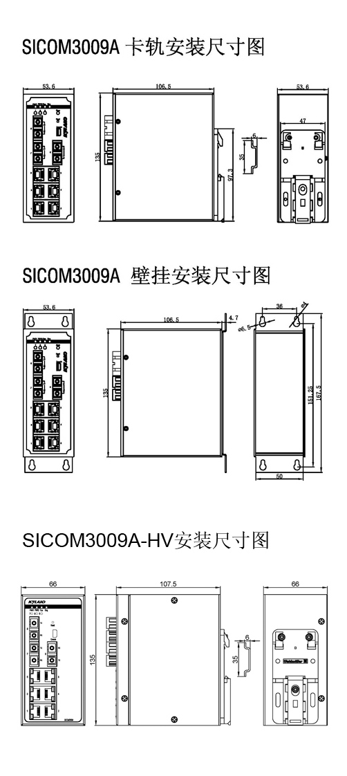 | 機械結構 | 外殼 金屬材質 散熱方式 自然冷卻,無風扇 防護等級 IP40 尺寸 53.6mm×135mm×106.5mm(W×H×D) (12/24/48VDC); 66mm×135mm×107.5mm (W×H×D) (220VAC/DC) 重量 0.76Kg 安裝方式 DIN卡軌式或壁掛式 |