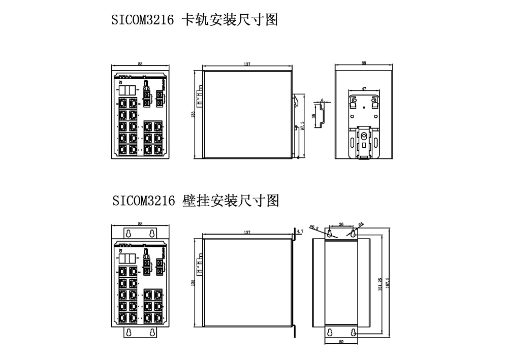 | 機械結(jié)構(gòu) | 外殼 金屬材質(zhì) 散熱方式 自然冷卻,無風扇 防護等級 IP40 尺寸 88mm×135mm×137mm(W×H×D) 重量 1.25Kg 安裝方式 DIN卡軌式或壁掛式 |